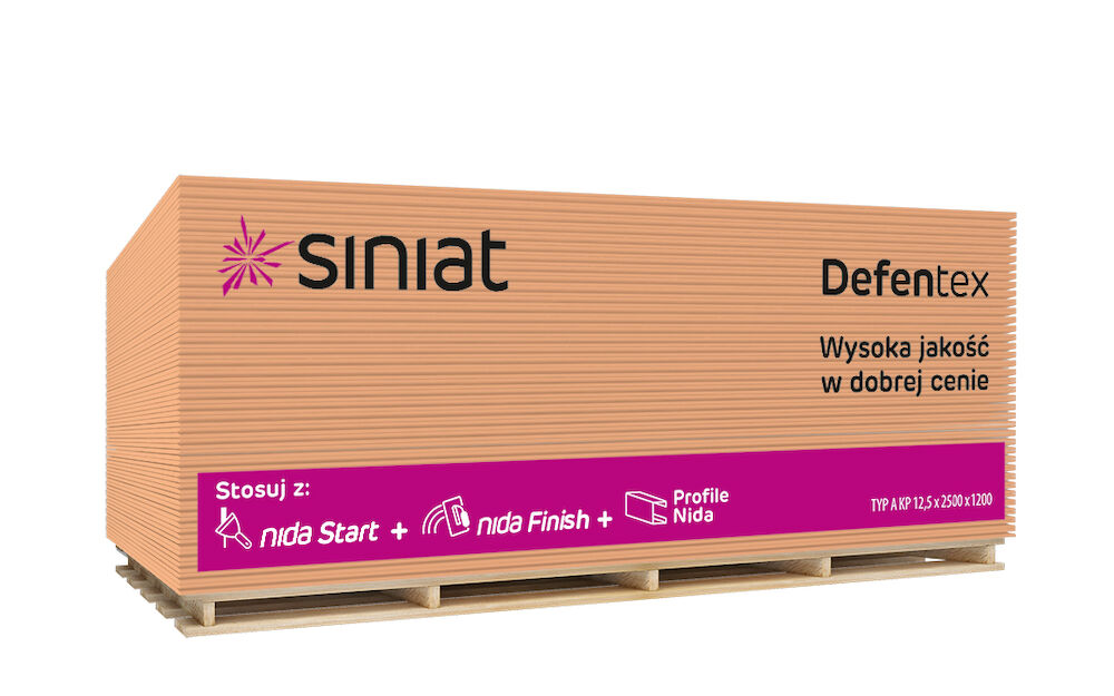 Конструкційна гіпсоволокниста плита високої щільності (1200 кг/м3), відповідно до Європейського технічного дозволу № ETA-19-0690. Перша плита в пропозиції Siniat, призначена для використання в каркасному будівництві. Вага плити та добавки, що зміцнюють серцевину, забезпечують дуже високі механічні параметри , що особливо важливо в конструкціях на основі дерев’яного каркасу. Плита має одностороннє покриття зі скловолокна, завдяки чому водопоглинання зведено до мінімуму . Плита характеризується високою дифузійною відкритістю, що робить її ідеальним матеріалом для екологічного каркасного будівництва . Плита Defentex складається з гіпсової серцевини, збагаченої скловолокном, а також гідрофобними та фунгіцидними речовинами . Більше того, покриття плити – це скловолокно. Як серцевина, так і покриття - у поєднанні - забезпечують дуже хорошу довговічність плити у вологому середовищі, майже повністю блокуючи доступ води до внутрішньої частини плити.