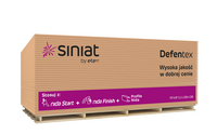 Конструкційна гіпсоволокниста плита високої щільності (1200 кг/м3), відповідно до Європейського технічного дозволу № ETA-19-0690. Перша плита в пропозиції Siniat, призначена для використання в каркасному будівництві. Вага плити та добавки, що зміцнюють серцевину, забезпечують дуже високі механічні параметри , що особливо важливо в конструкціях на основі дерев’яного каркасу. Плита має одностороннє покриття зі скловолокна, завдяки чому водопоглинання зведено до мінімуму . Плита характеризується високою дифузійною відкритістю, що робить її ідеальним матеріалом для екологічного каркасного будівництва . Плита Defentex складається з гіпсової серцевини, збагаченої скловолокном, а також гідрофобними та фунгіцидними речовинами . Більше того, покриття плити – це скловолокно. Як серцевина, так і покриття - у поєднанні - забезпечують дуже хорошу довговічність плити у вологому середовищі, майже повністю блокуючи доступ води до внутрішньої частини плити.