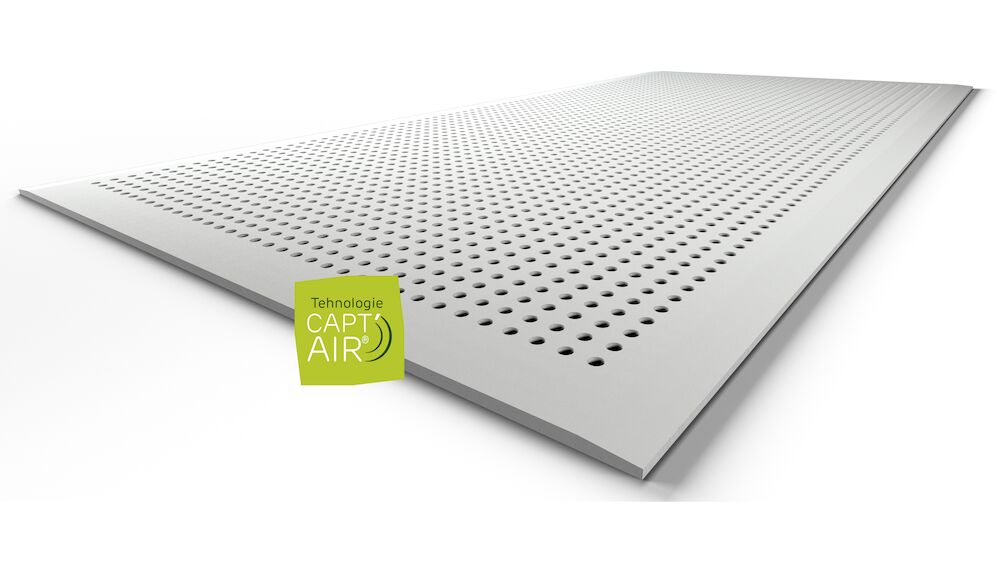 Шумопоглинаючий гіпсокартон для безшовного облицювання з круглою перфорацією, модульне розташування, 1 поле по всій поверхні плити, спеціально для використання в приміщеннях з великим об’ємом і високими вимогами до акустичного комфорту. Акустичний фліс доступний у білому або чорному кольорі.